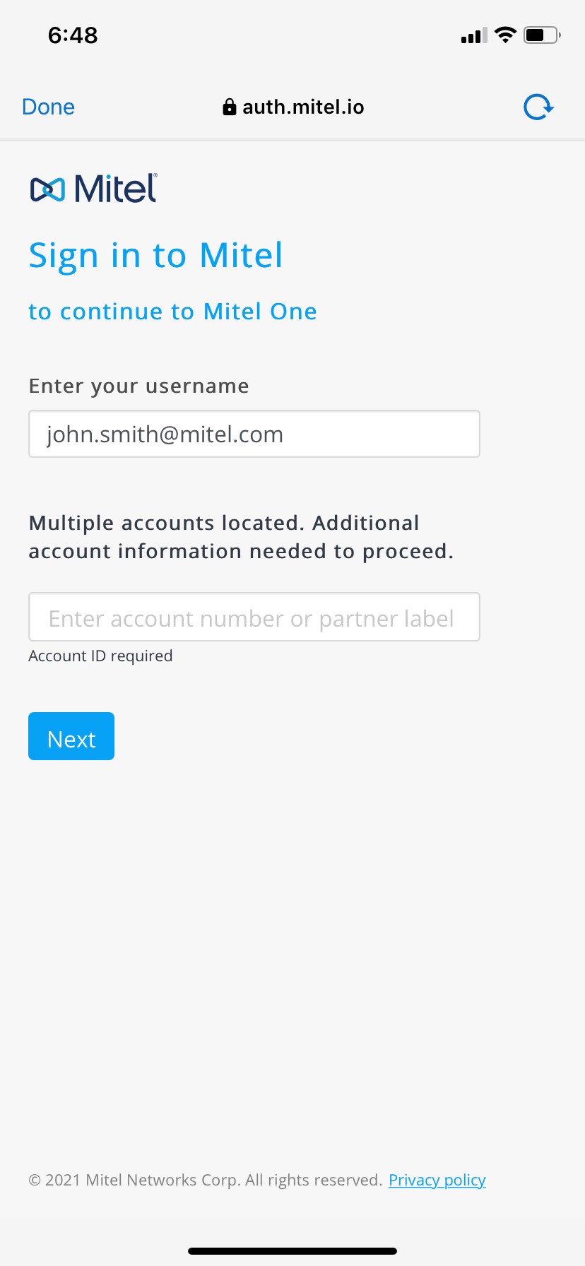 - Aprire Mitel One Application sul telefono e toccare Accedi. Viene visualizzata la pagina di accesso per gli utenti Mitel.