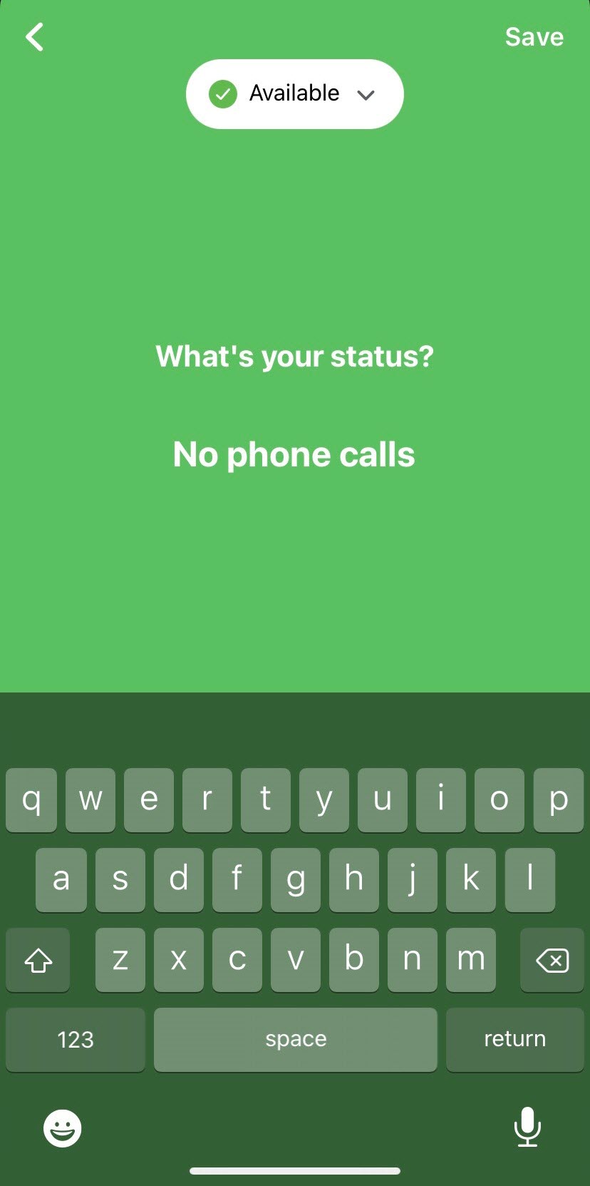 - Voer in het veld Hier invoeren uw gewenste bericht in en tik op Opslaan om het bericht op te slaan als uw statusbericht.