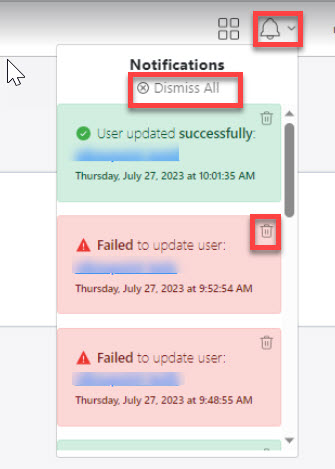 Note: The Dismiss All option will remove the notifications from the current view, however, a page refresh, or a new notification will reload all notifications. Use the